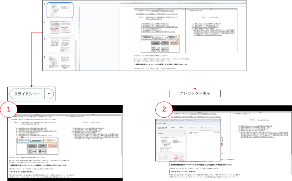 しかし「スライドショー」横のボタン(赤枠で囲った箇所)から「プレゼンター表示」を選択すると自画面には下の画面②が表示されます。しかし、相手の画面に共有されているのは下の画面①になっているので大丈夫です。